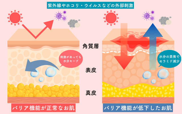 貯水ダムのように水分量が十分であれば跳ね返す力がありますが、乾燥している状態ですと刺激の原因となるアレルゲン、花粉、ホコリ、細菌などの刺激によりダメージを受けます。